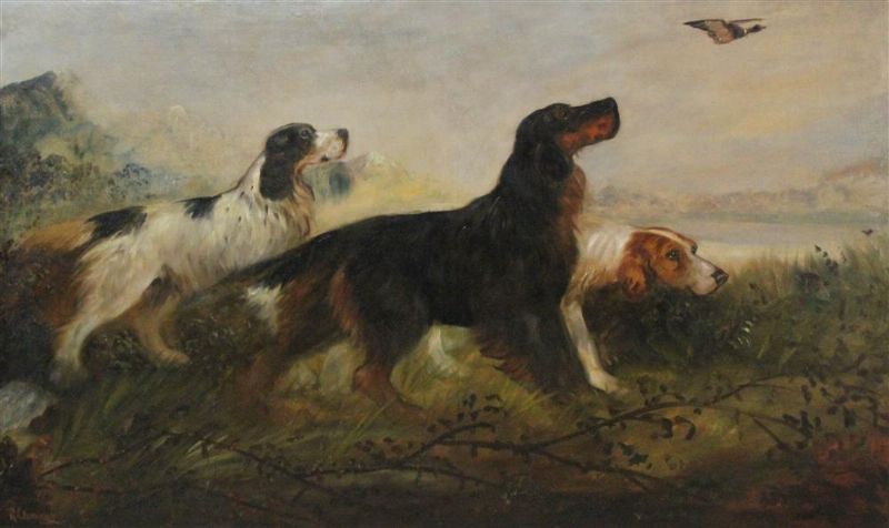 SPANIELS SNIFFING DUCK IN FLIGHT