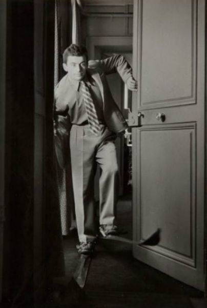 Portrait de Maurice Baquet sortant de chez lui à skis