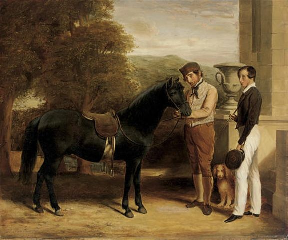 Portrait of a Boy with his Pony, a Groom and a Spaniel outside a House