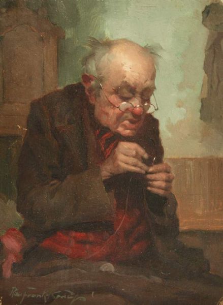 Schneidermeister beim Einfädeln des Fadens