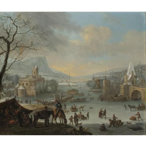 | AN EXTENSIVE WINTER LANDSCAPE WITH SKATERS ON A FROZEN RIVER AND PEASANTS WARMING THEMSELVES NEAR A FIRE IN THE FOREGROUND | |
