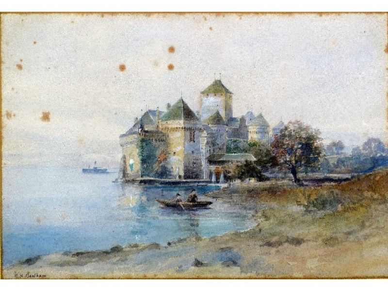 | Continental river scene with castle, small steamer and rowing boat with figures in foreground | |