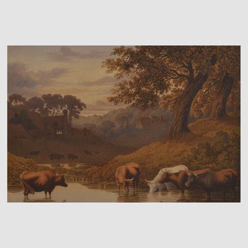 CATTLE WATERING IN A WOODED LANDSCAPE