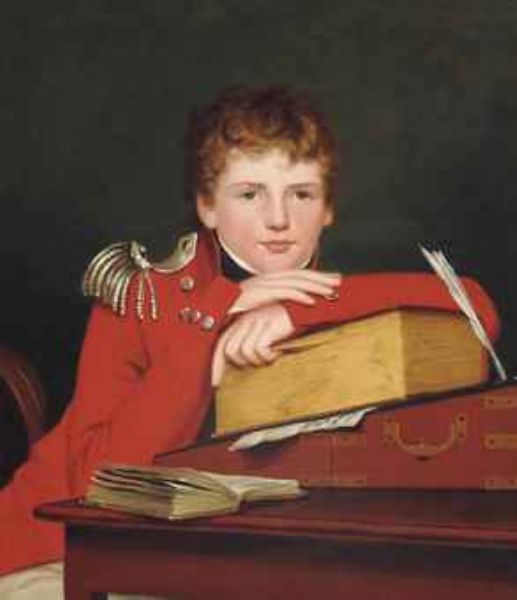 | Portrait of a boy, half-length, in uniform, leaning on a book on a writing desk | |