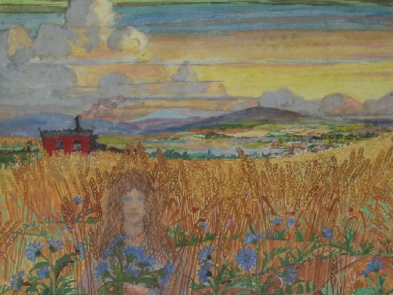 | A YOUNG GYPSY GIRL gathering corn flowers in a barley field, a vardo in the background | |