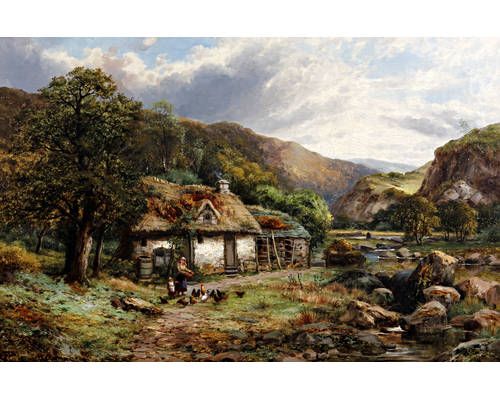 | Mother and child feeding hens before a tumbledown thatched cottage by a river | |