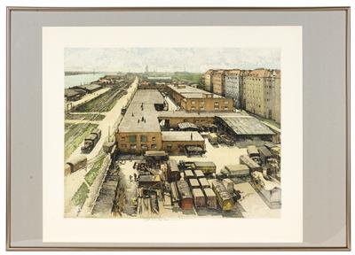 Ansicht vom Handelskai in Wien mit Lagerhäusern der Spedition Intercont