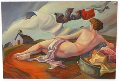 | nude female reclining under clothes line | |