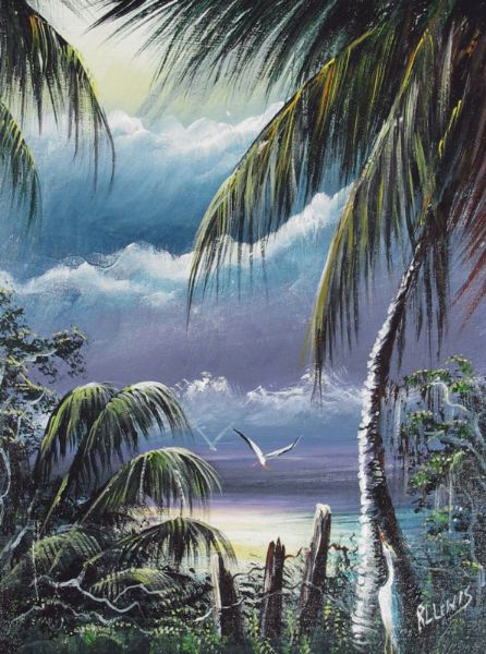 FLorida Highwaymen coastal landscape featuring palm trees and birds