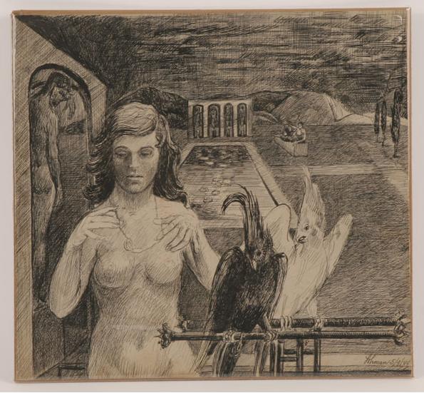 | Courtyard with female nude and cockatoos | |