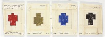 | Watercolor gold leaf, enamel and paper collage on paper | |