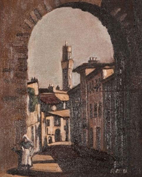 EUROPEAN STREET SCENE WITH STONE ARCHWAY