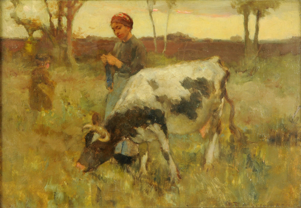 Shorthorn with milkmaid and child in landscape