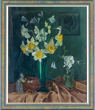 Narzissenstrauß in grüner Glasvase, Mispelzweig und Christrose in Glaskrug