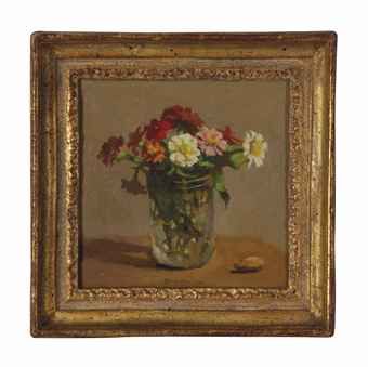 Zinnias in a Glass Jar with an Almond