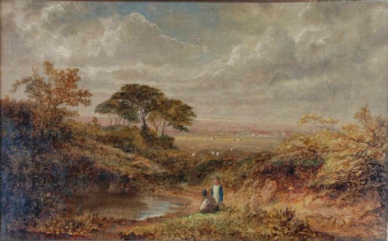 | Children beside a stream in an extensive rural landscape with sheep and houses in the distance | |