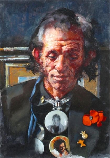 | Bust portrait of a gentleman, depicted facing frontally wearing American eagle emblem, Elvis Presley badges and Remembrance D | |
