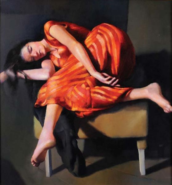 | Esther in orange and red dress, asleep on a chair | |