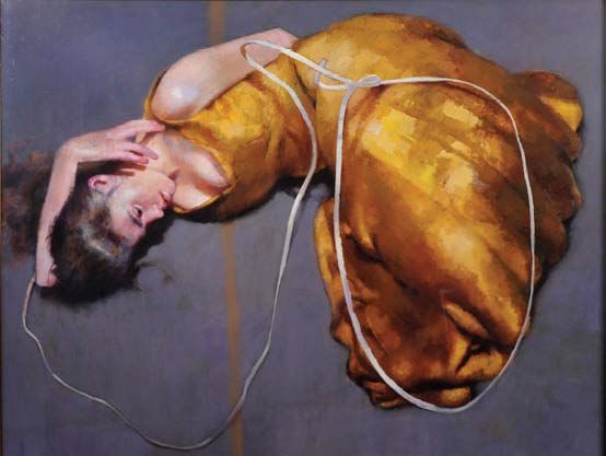 | Roxanna in gold dress with white electrical cord on the floor | |