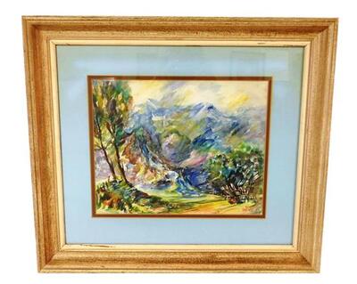 | Depicting mountainous landscape in blues, violets, and greens | |