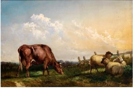 | Klebezettel mit Bez. von alter Hand. Weidelandschaft mit Kuh und Schafen neben Gatter. Prachtvolle morgendliche Beleuchtung. | |
