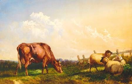Weidelandschaft mit Kuh und Schafen neben Gatter