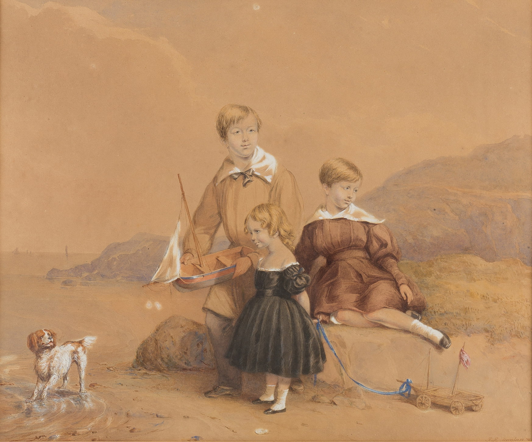 Three Children on the Beach/with a dog and a toy yacht