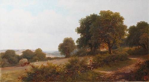 Rural landscape with farm workers and a figure of a girl in the foreground