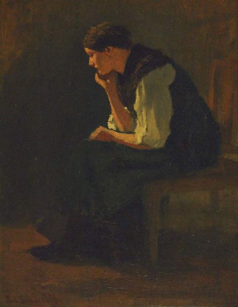 | Junge Frau in Tracht, auf Stuhl sitzend in Seitenansicht, den Kopf nachdenklich auf rechter Hand gestützt | |