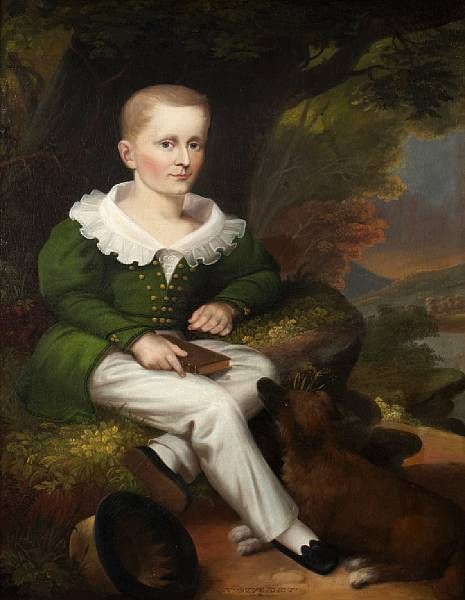 A portrait of a boy with a dog seated at his feet