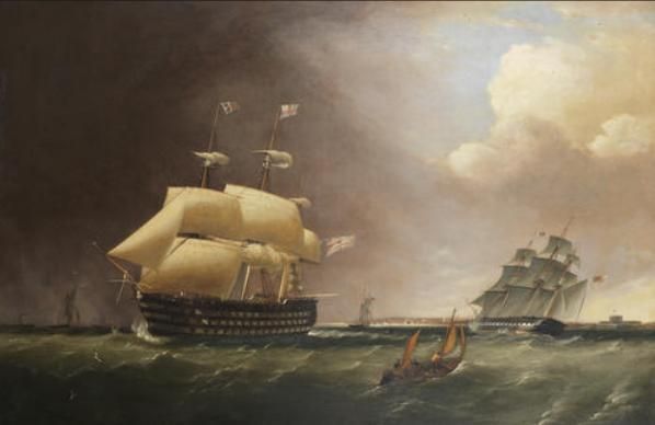 | H.M.S. Nelson outward bound from Portsmouth, in a heavy swell, with a frigate heading into port off her stern | |