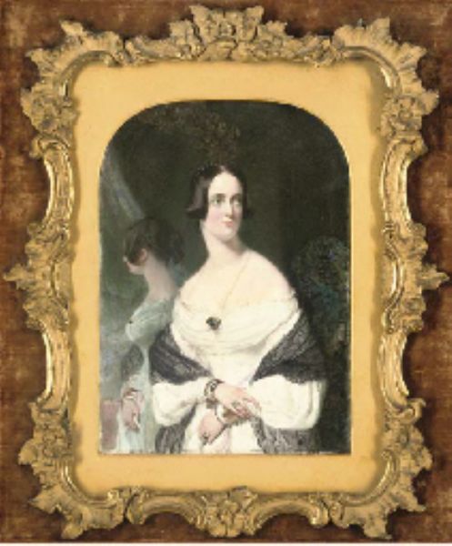 | A young lady, in sprigged white dress with black lace stole over her arms, gold brooch at corsage, gold bracelets and rings, her | |