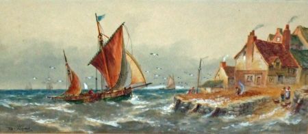 Busy Coastal Scene with Fishing Boat, Figures and Cottages