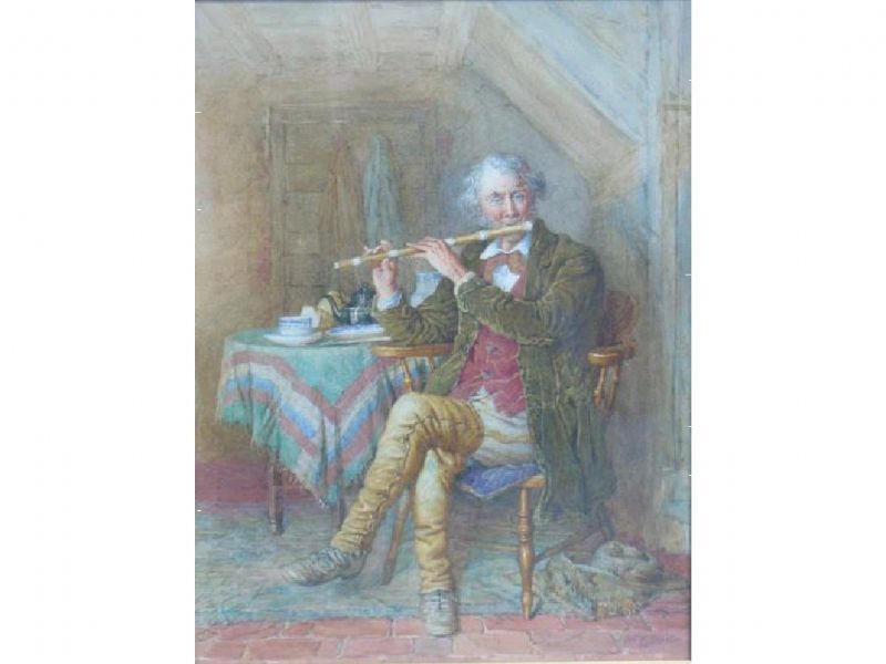 A rustic playing a boxwood flute in a cottage interior