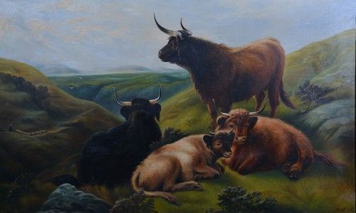 | Highland cattle in a landscape with the shepherd and sheep in the near distance. | |