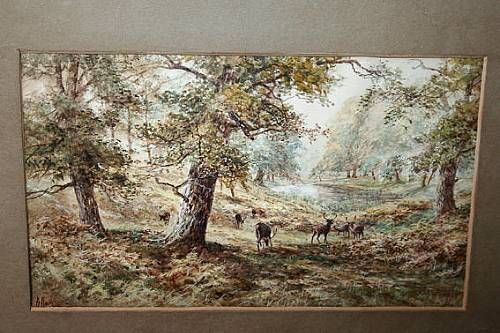 Deer grazing in woodland, a pond in the mid distance, signed Allom lower left