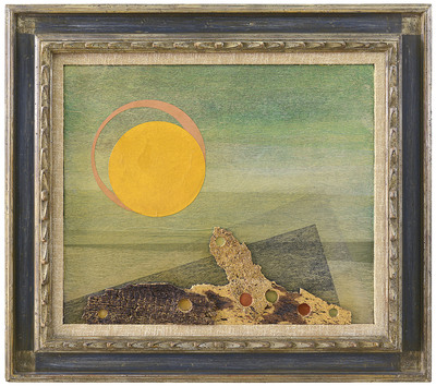 tecnica mista, sughero e collage su tavola 54x65 cm, firma, anno, timbro della Galleria La Tavolozza (Montecatini Terme) ed etichetta della Società delle Belle Arti, mostra "Mezzo Secolo d'Arte Toscana" al retro, certificato di provenienza della Fabi | |