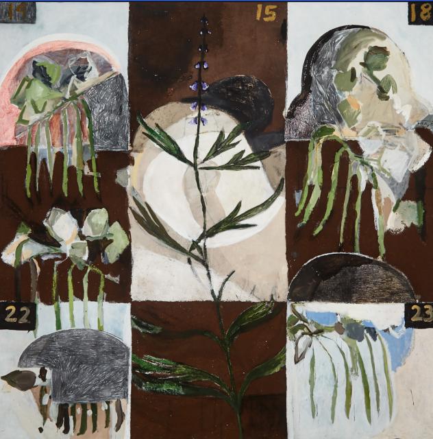 | Mixed Media with acrylic, charcoal, gravel and peat moss on linen | |