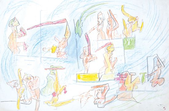 | Crayon wax crayon, coloured chalks and pencil on Arches paper | |