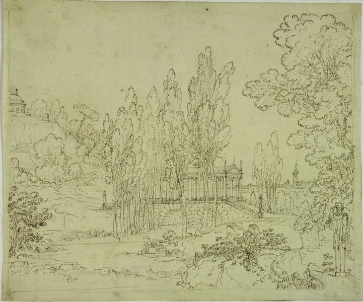 Paesaggio fluviale con ponte in forma di tempio ed erma