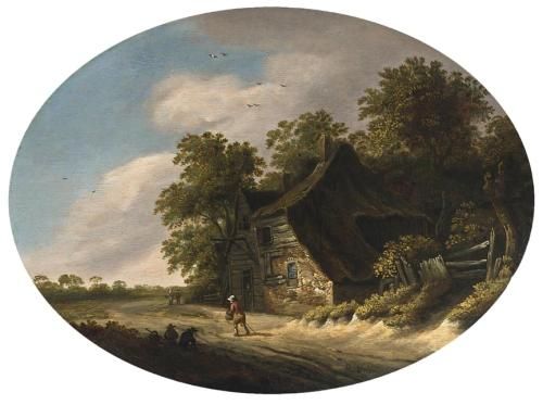 | A LANDSCAPE WITH TRAVELLERS ON A PATH PASSING A FARM | |