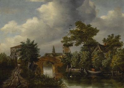 | A RIVER LANDSCAPE WITH A WOODEN GATE, A BRIDGE, A NEARBY VILLAGE, A BOAT, AND FIGURES | |