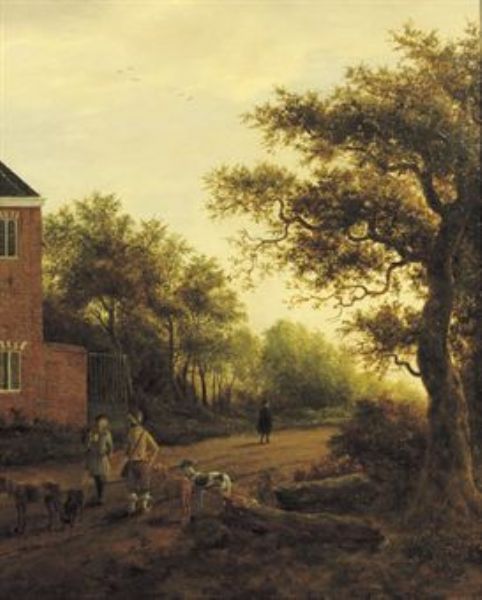 | A wooded landscape with hunters and dogs on a track near a house | |