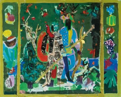 | Pêcheur et Chasseur Projet pour la tapisserie titrée Pêcheur et Chasseur, pour l'Assemblée Nationale d'Abidjan | |