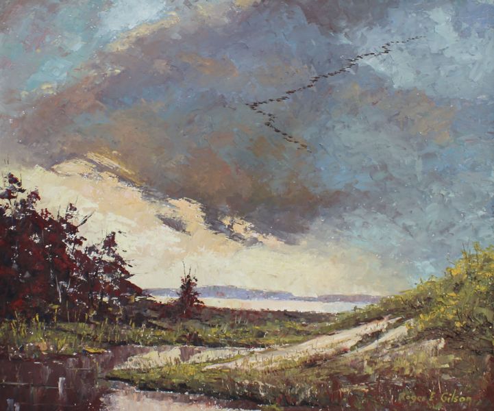 Geese in Flight Over an Autumnal Lakeside Landscape