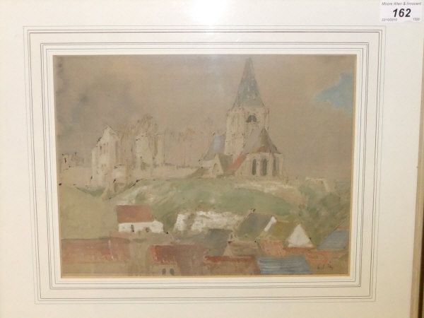 Study of a French village with houses and church and ruins