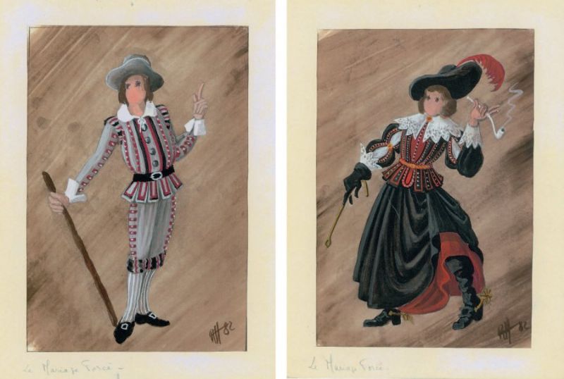 3 maquettes originales de costumes pour Le mariage forcé