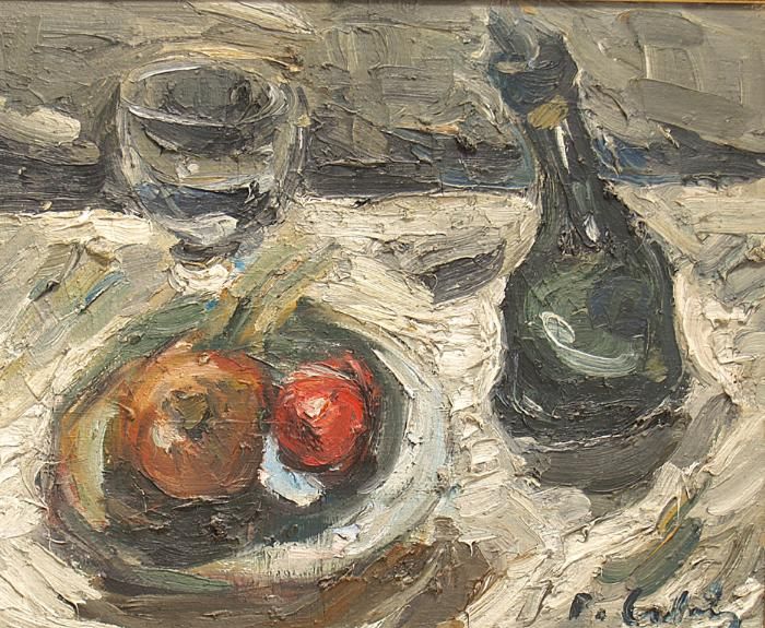 Stillleben mit Armagnacflasche und Teller, so rückseitig betitelt