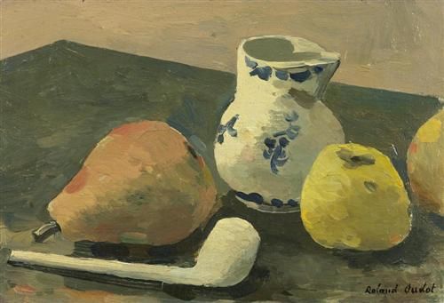 Stilleben mit Birne, Apfel, Krug und Pfeife