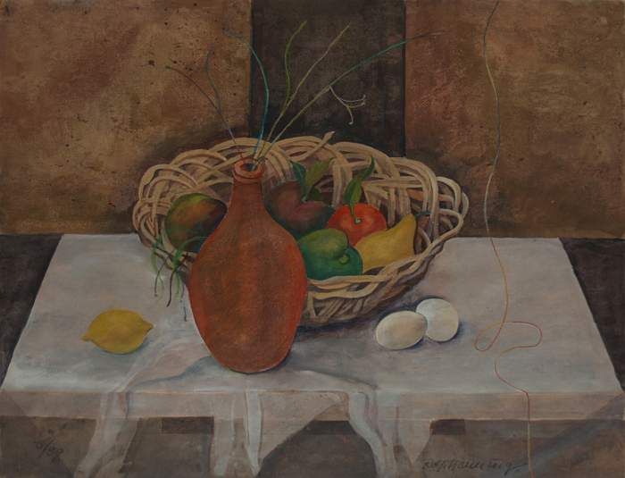 Früchtestilleben mit Früchten im Korb, Tonvase, Eier und gelber Zitrone